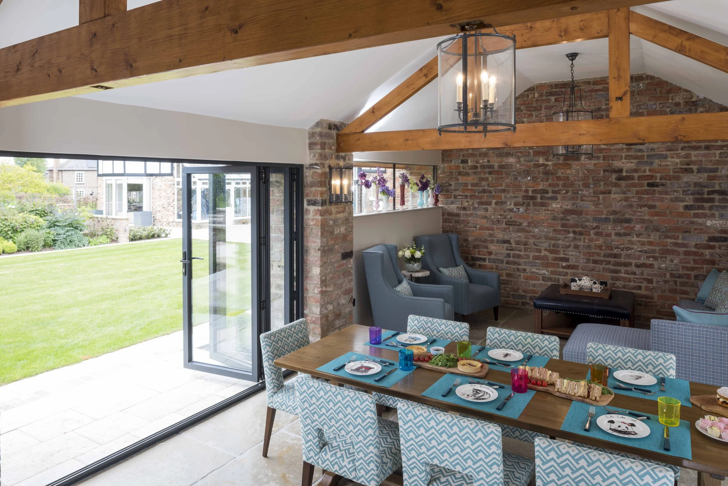 Averil took her cues for this flexible entertaining space from the surrounding architecture, using reclaimed handmade bricks to marry the architecture to the neighbouring original buildings. Internally neutral finishes tie the space to the original features of the property and fun was added through colourful fabrics. The three-bay design of the space makes it inherently adaptable.